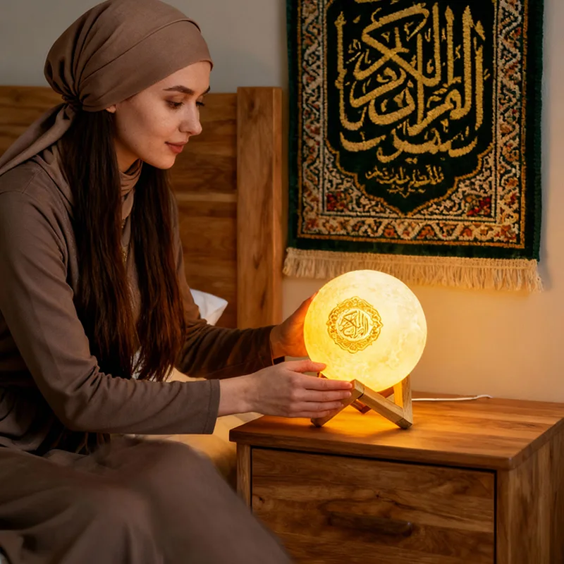 Le Style A se distingue par sa forme sphérique texturée rappelant la surface de la lune. Sa lumière blanche et ses finitions soignées en font l’accessoire idéal pour une chambre à coucher ou un salon, créant une atmosphère de sérénité absolue pendant l’écoute du Saint Coran.
